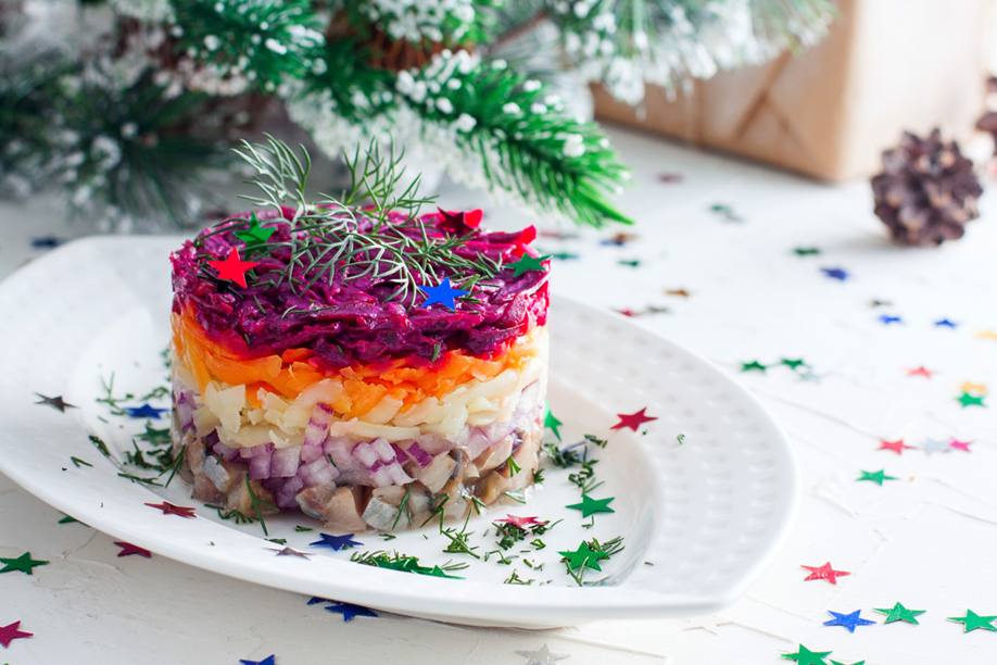 Салаты. Лучше готовить овощные салаты с добавлением небольшого количества мяса и копченостей. Овощи символизируют плодородие и достаток – от такого вряд ли кто-то откажется. Идеальным блюдом будет классическая “Сельдь под шубой” – здесь присутствуют и овощи, и морская рыба. Также в салаты можете добавлять грибы, яйца, курицу, орешки, пророщенные зерна пшеницы, цветную капусту и картофель.