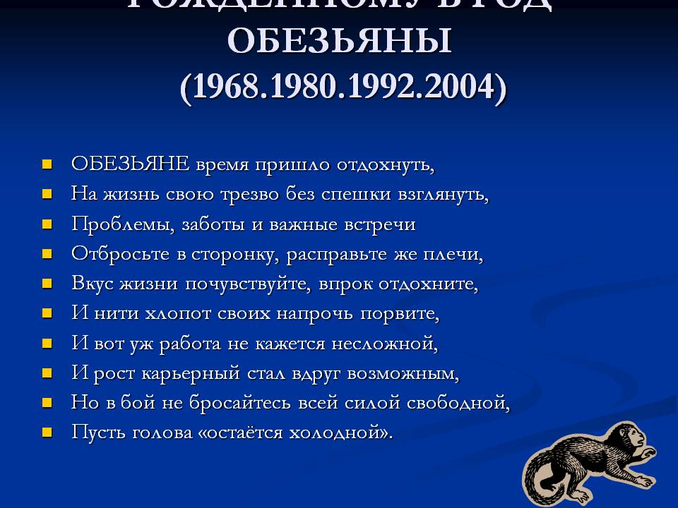 Обезьяны, согласно восточного гороскопа, являются очень общительными и любознательными личностями. Именно эти люди благодаря своему обаянию и достаточно изворотливому уму добиваются высоких результатов и неплохих успехов, все, что задумано у них обязательно получается, поэтому их почти всегда и везде ожидает признание и успех.