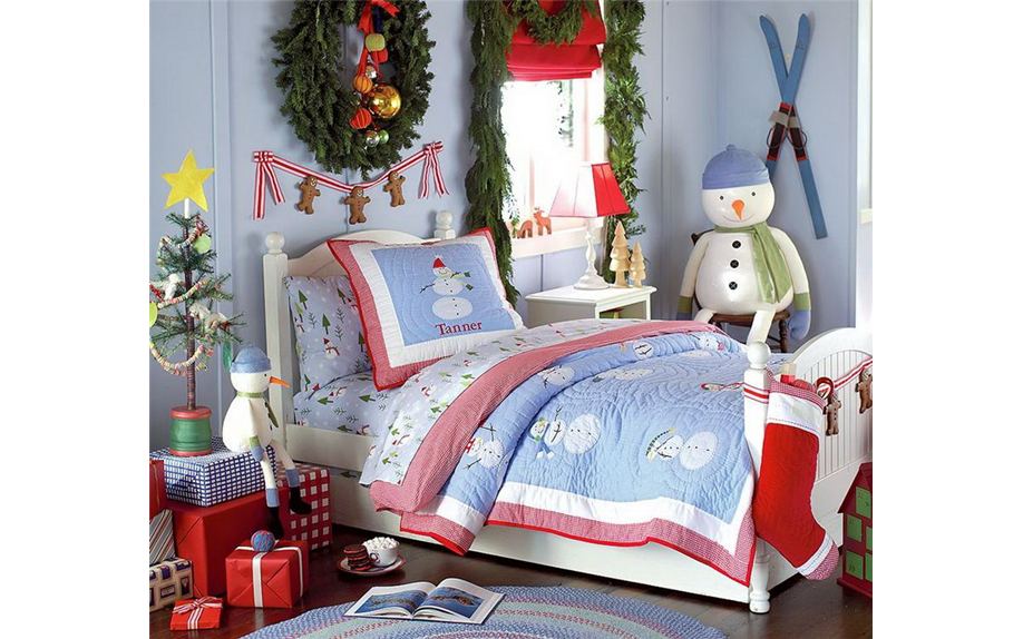 Диван или кровать украсьте декоративными подушками и покрывалами с узором. Если место позволяет, поставьте для малыша свою отдельную елочку. Все пустые поверхности можно украсить салфетками или покрывалами с новогодними узорами. Для совсем маленьких елочку можно нарисовать или сделать из бумаги.