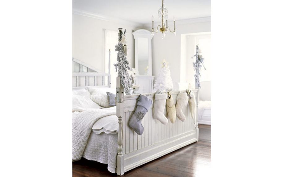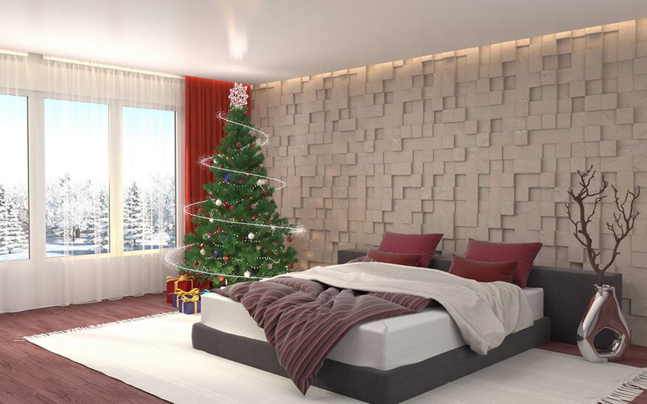 Основными элементами декора будет текстиль и новогодние аксессуары. Еловыми веточками можно оформить вазу на прикроватном столе или подоконнике, а на двери повесить рождественский венок. На окно поставьте свечи, и для полноты картины добавьте небольшую вазу с фруктами.