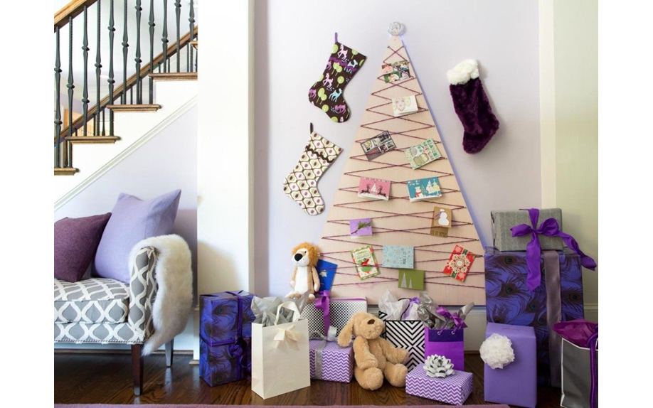 Если нет елки, ее можно сделать своими руками из подручных материалов. Отлично подойдут цветные гирлянды или еловые веточки, которые можно прикрепить на стену, двери или окна. Не забудьте оставить под основанием деревца немного места для сувениров и подарков.