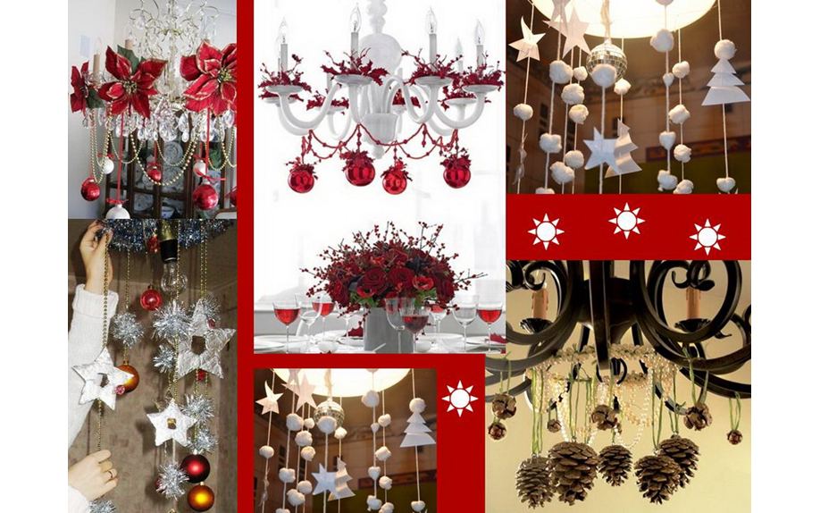 Украшая люстру, следует учитывать ее размеры. Большие оформляются так же, как и елка, а небольшие светильники достаточно обернуть у основания новогодним дождиком. Для декорирования используются самые различные элементы, которые создадут особую праздничную атмосферу.