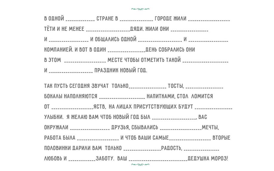 Коллективное поздравление. Суть задания в том, чтобы составить письмо по имеющемуся шаблону. В нем уже есть текстовый “каркас”, но пропущены все прилагательные. Ведущий объявляет, что ему нужна помощь в составлении поздравления и предлагает гостям по очереди называть прилагательные, связанные с зимой и праздниками. Каждое слово он вписывает в письмо, заранее не оглашая весь текст. Когда все пустующие места в письме будут заполнены, ведущий зачитывает поздравление вслух – должно получиться очень забавно. Текстовый пример можно взять здесь: