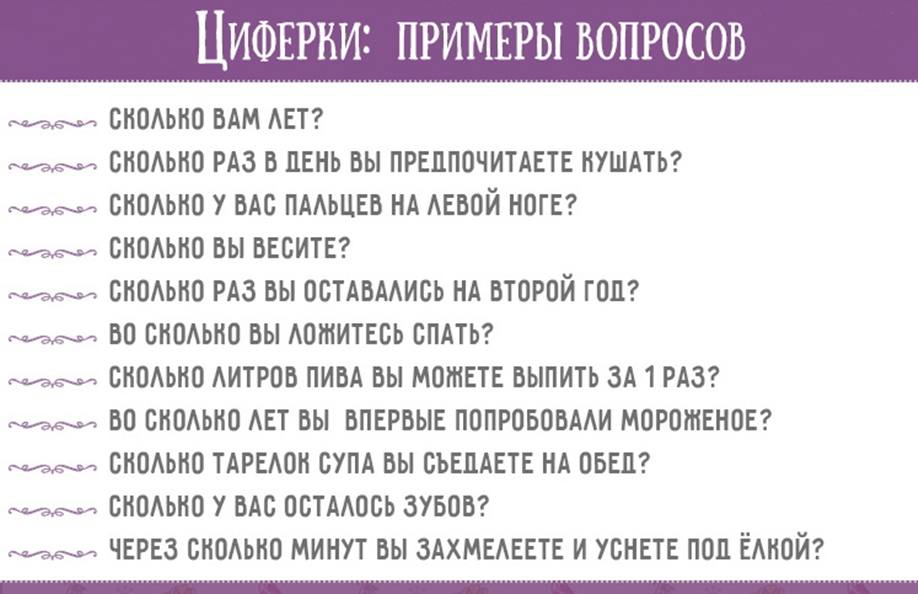 Забавные цифры. Конкурс построен по принципу вопрос/ответ и всегда с воодушевлением принимается гостями. Каждый участник получает от ведущего бумагу и ручку – на листе он должен написать любую цифру, которая ему придет в голову. Если планируется несколько кругов, можно записать сразу несколько цифр или чисел. Ведущий объявляет, что это развлечение поможет получше друг друга узнать. Он задает заранее заготовленный вопрос, а участник должен дать на него ответ, громко произнося свою цифру/число, записанные на листочке. Вопросы подбираются самые простые, чтобы ответы вышли смешными. Вот примерный список: