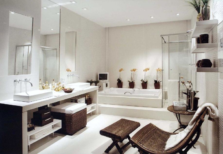 Мебель. Стремительно набирают популярность бионические раковины с обилием хромированных деталей и искусственно состаренными смесителями. Для хранения ванных принадлежностей подойдут открытые и встроенные шкафчики, полки и подставки. В моде узкие длинные столешницы со встроенными рукомойниками и столиками для макияжа. В целом выбор мебели будет зависеть от площади помещения.