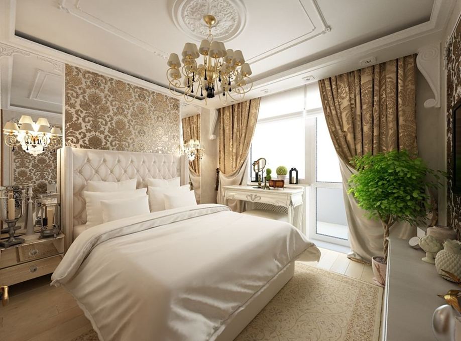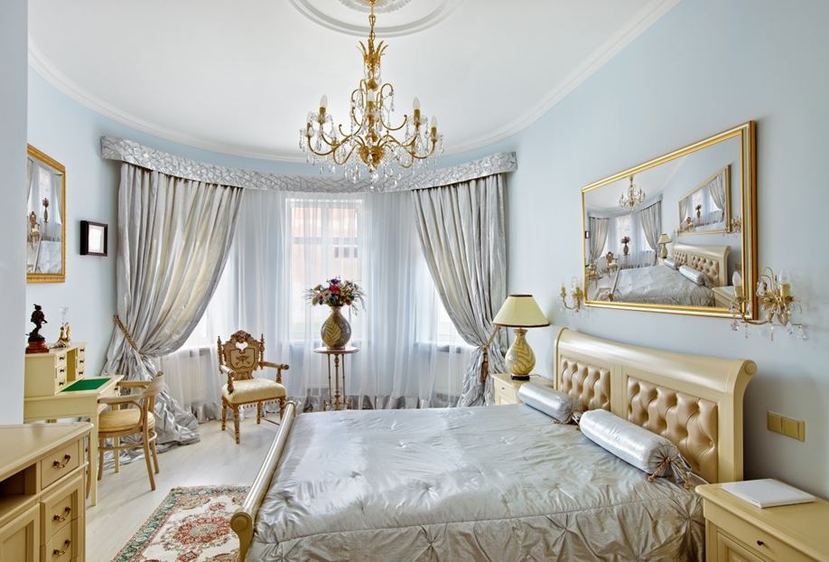 Классика. Классический стиль в современном понимании – это сочетание нескольких течений, таких как ренессанс, барокко, рококо, модерн и минимализм. Спальня в классическом стиле обязательно ассоциируется с роскошью. Здесь присутствуют тяжелые складчатые драпировки, хрустальные люстры, зеркала в тяжелых рамах, натуральное дерево, золотистые и серебристые элементы декора. Придать интерьеру еще больший шик помогают антикварные вещи, бархатная обивка, статусные люстры и светильники.