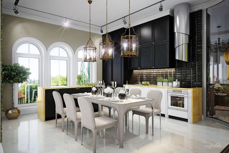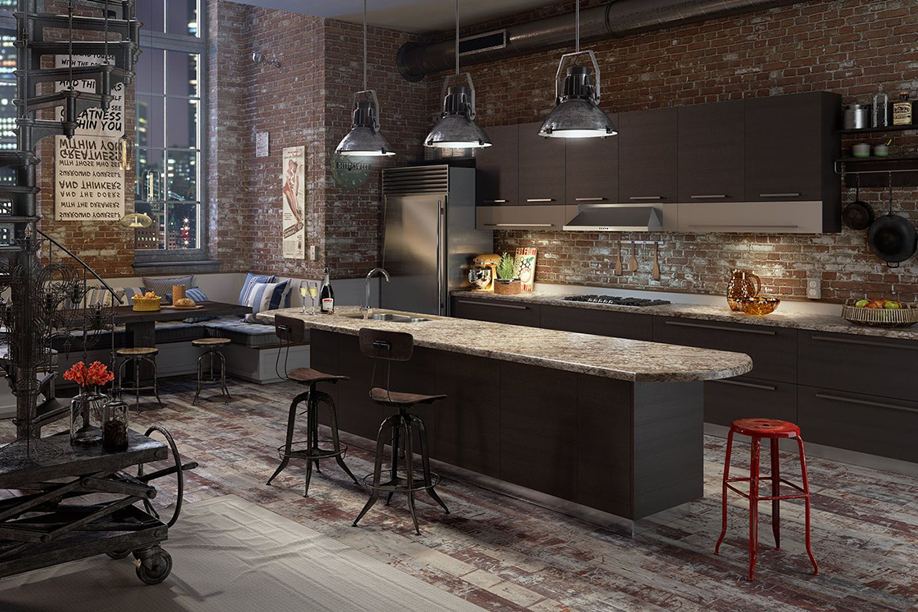 Лофт. “Чердачный” стиль будет как никогда уместен на современной кухне. Для дизайна характерны грубые индустриальные материалы, открытые системы коммуникаций, высокие оконные конструкции и строгая цветовая палитра. На потолках создают имитацию стропил, фальшивых балок и окон, для зонирования часто прибегают к использованию барной стойки, разницы фактур или уровней освещения.