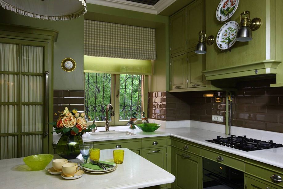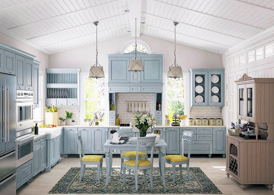 Прованс. Модный в этом сезоне флористический принт с легкостью поможет воплотить кухонный интерьер в стиле французского шика. Цветочные принты присутствуют на шторах и салфетках, подушках и обивке стульев, скатертях и напольных покрытиях. Оттенки стоит выбирать пастельные, стены оформляют в виде кирпичной кладки, мозаики и керамики. Новомодных технических приспособлений должно быть по минимуму, а вот винтажных вещиц – сколько угодно.