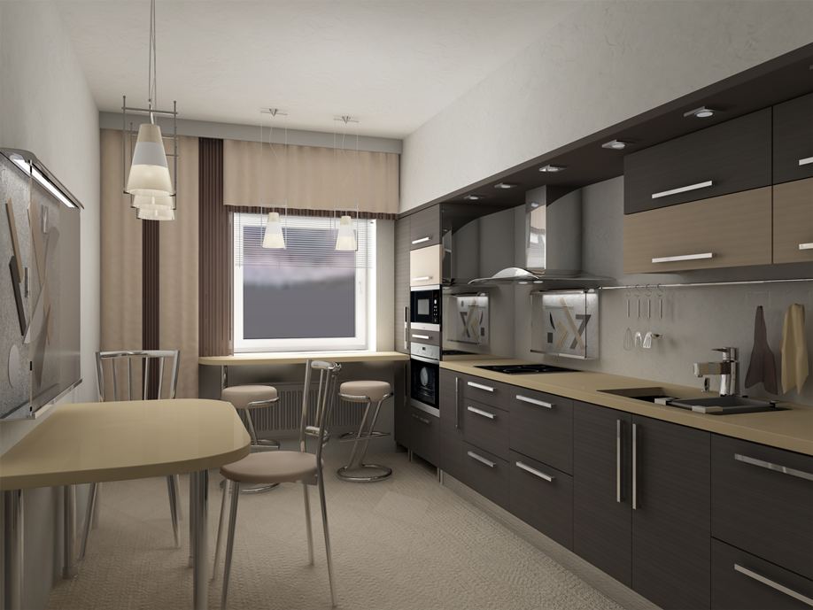 Цвет. Самым востребованным будет белый цвет в интерьере – наиболее актуальный для современных кухонь и бытовой техники. К сожалению, белоснежная мебель не отличается практичностью, поэтому наверняка найдутся желающие оформить кухню в других, не менее трендовых тонах – оливковом, сером, фиолетовом, лимонно-желтом, голубом. Добиться эффектного внешнего вида помещения удается при помощи грамотного сочетания контрастных оттенков – белый с коричневым, бежевый с шоколадным, черный с фиолетовым и пр. Светлые тона будут востребованы среди обладателей малогабаритных кухонь – они делают помещение визуально более просторным.