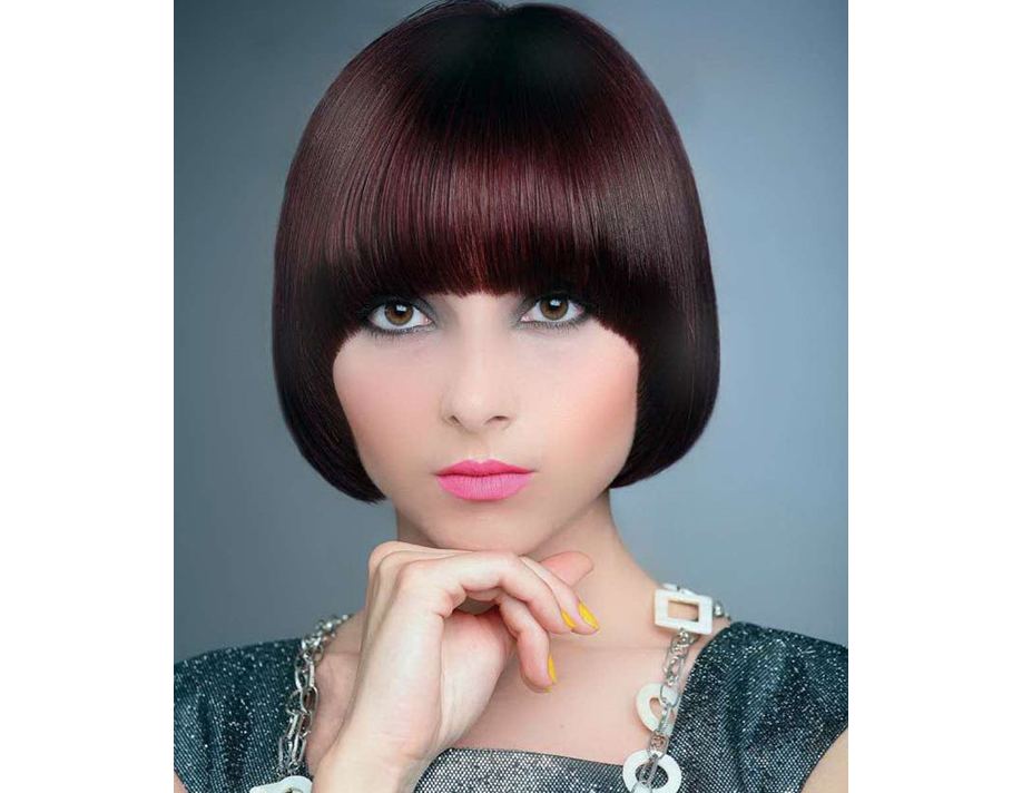 Технология выполнения стрижки довольно сложна и требует определенного мастерства парикмахера. Волосы состригаются послойно под определенными углами для создания строгого овала у лица. Полукруглая форма челки плавно переходит к зоне висков, спускаясь к затылку с легким подкручиванием внутрь.