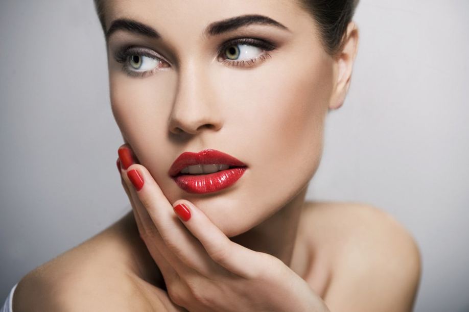 - Красная помада. Косметика такого плана сегодня выступает базовым ярким акцентом макияжа. Допускается два варианта нанесения помады – четкие контуры, созданные карандашом, либо эффект “зацелованных” губ, когда красный слой слегка растушевывается пальцами от центра к краям.