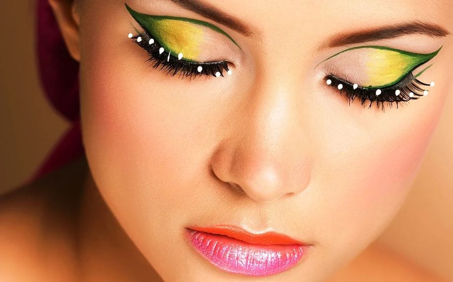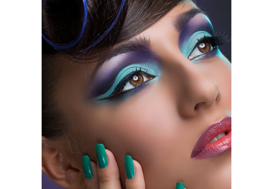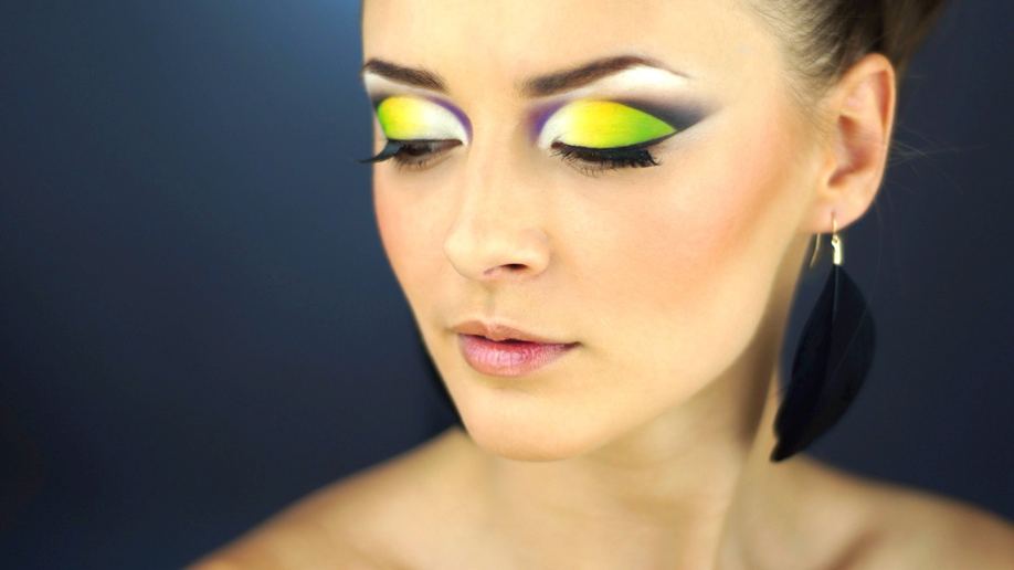 - Цветные тени. Из палетки выбираются не просто насыщенные тени, а представители очень яркой, живой палитры. Для создания макияжа визажисты применяют лазурные, серебристые, фиолетовые, красные, черные и зеленые тени, больше похожие на фломастеры. Чаще всего это один оттенок на веках в виде акцента, которым обрамляют верх и низ глаза.