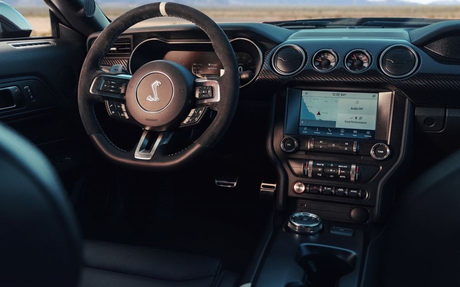 Форд Шелби преобразился на все 100%. Передок отчетливо подчеркивается большеразмерным отсеком для забора воздуха. Новые фары с тремя линиями ДХО, противотуманки, и массивный бампер — все это составляющие нового Мустанга. Задняя часть имеет незначительные признаки сходства с предшественником, но на новинке все выглядит более стильно и богато. Салон соответственно тоже новый, где установлена цифровая приборка, новая конструкция передней панели, комфортные сиденья и самые дорогостоящие материалы для отделки.