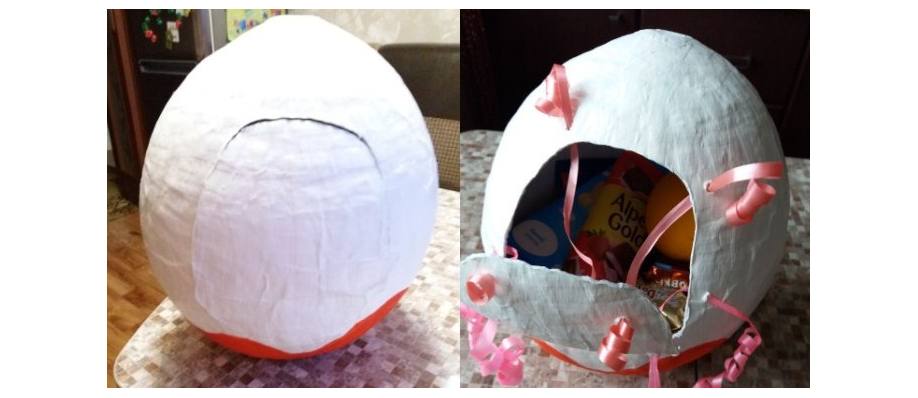 • Наполнив яйцо любимыми лакомствами ребенка, закрываем дверцу (фиксируя ее с помощью лент) и заворачиваем его в большой лист прозрачного целлофана.