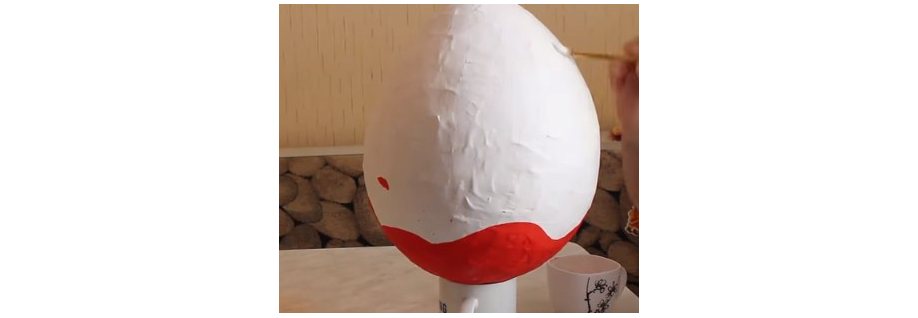 • Для маскировки стыков покрываем яйцо толстым слоем белой краски. Дождавшись ее высыхания, простым карандашом намечаем на нижней части яйца контур волн и капель, а затем закрашиваем их, используя красную краску. Для того чтобы краска не растрескивалась и не оставляла следов на руках, смешиваем ее с небольшим количеством клея ПВА.
