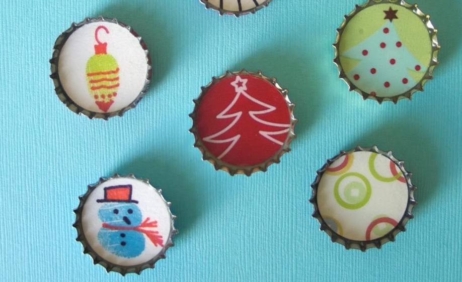 Легкий подарок, для создания которого потребуется не более получаса, можно смастерить из металлических крышек для пивных бутылок. Достаточно лишь вырезать кружок из подарочной бумаги или лоскутка красивой материи и приклеить его к внутренней части крышки, а к противоположной стороне прикрепить магнит.