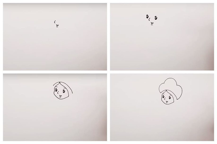 Затем дорисуйте шапочку и вертикальными чертами обозначьте прическу. К краю шеи пририсуйте две дугообразные линии – получится воротник. По бокам от воротника изобразите руки, в форме трапеции – туловище.
