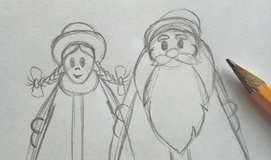 2. Изобразите наряды обоих персонажей – шубы с опушкой и воротниками. Деду добавьте бороду, а внучке – косички.