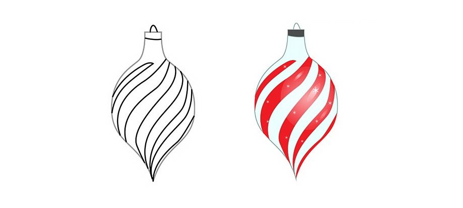 Большая красочная новогодняя игрушка способна стать центром композиции или даже самостоятельным рисунком. Проще всего рисовать ее в форме шара – потребуется только изобразить окружность и пририсовать в верхней части небольшой крючок для подвешивания. Можно оставить шар одноцветным, но лучше украсить – разрисовать звездами, снежинками, горизонтальными и вертикальными полосами. На одном из боков оставьте белый незакрашенный участок – так шар будет смотреться объемнее. Примерная схема рисования – на фото ниже: