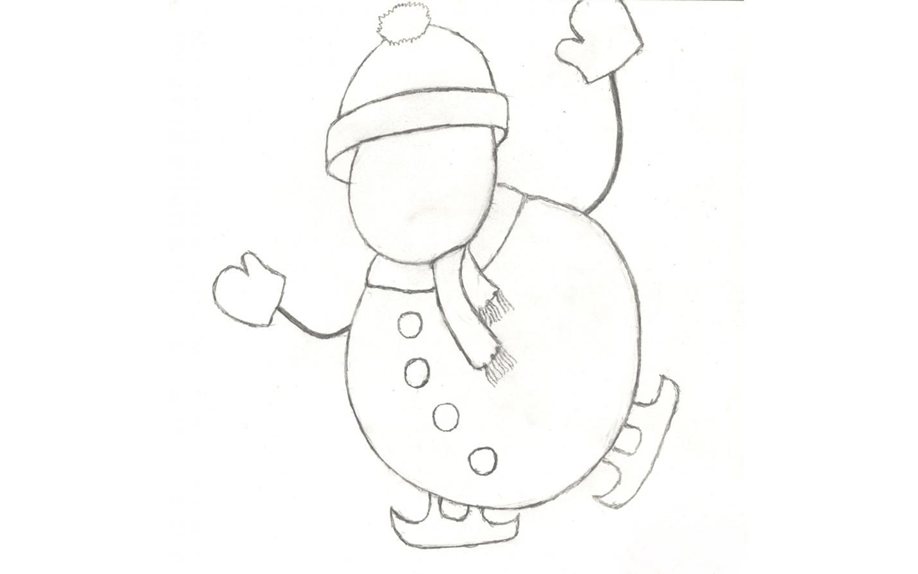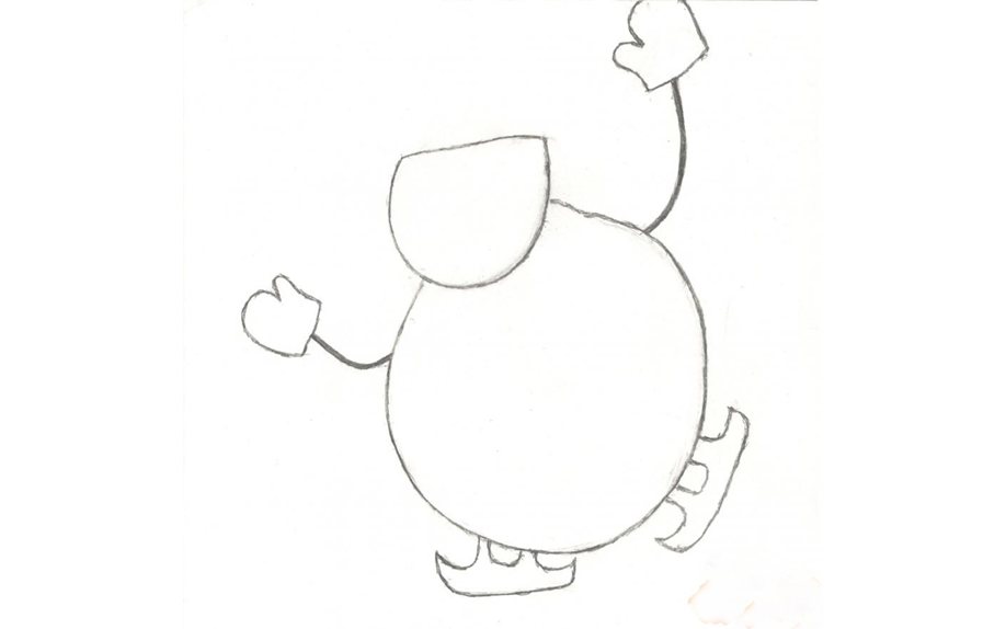 3. К нижнему кому схематично пририсуйте руки и изобразите варежки. Вместо ног пусть будут коньки.