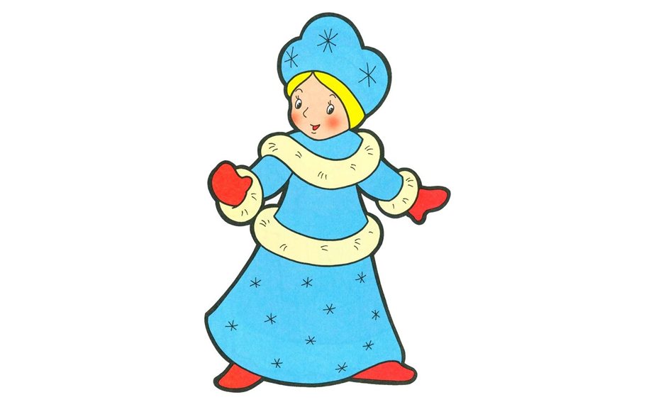 В центральной части трапеции обозначьте опушку, украсьте кокошник и подол снежинками или звездами. Раскрасьте Снегурочку – наряд пусть будет голубым, рукавички – красными, а волосы – блондинистыми.