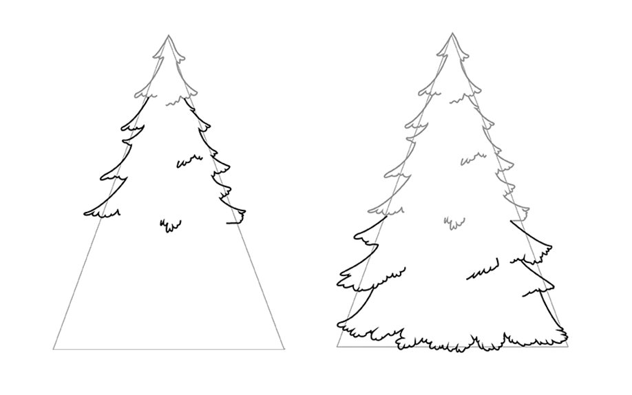 • Ориентируясь на треугольник, изобразите по три елочные ветки с двух сторон. Линии должны быть плавными, с изгибами, в том числе и по нижнему краю.