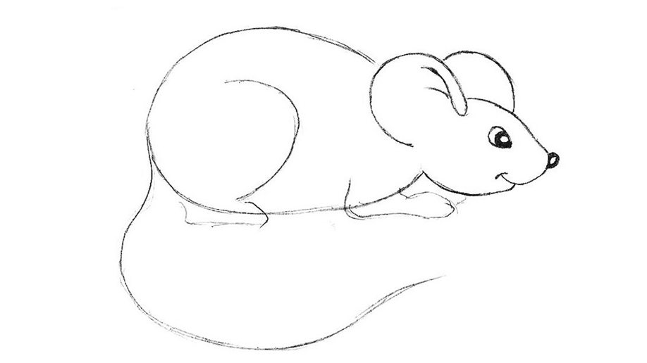 4. Сотрите лишние линии мордочки, добавьте объема хвосту, сделайте границы фигуры более четкими и уверенными. Закрасьте глаза и носик черным, оставив белым пару бликов. Милая мышка готова!