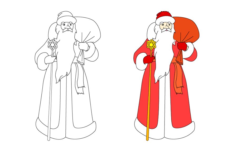 Пользуясь схемой, приведенной ниже, вы получите классический рисунок Деда Мороза с мешком. Вначале намечают расположение туловища и головы, затем пририсовывают мешок и конечности, детально изображают части тела и черты лица. Для раскрашивания подойдут цветные карандаши, гуашь или акварельные краски.