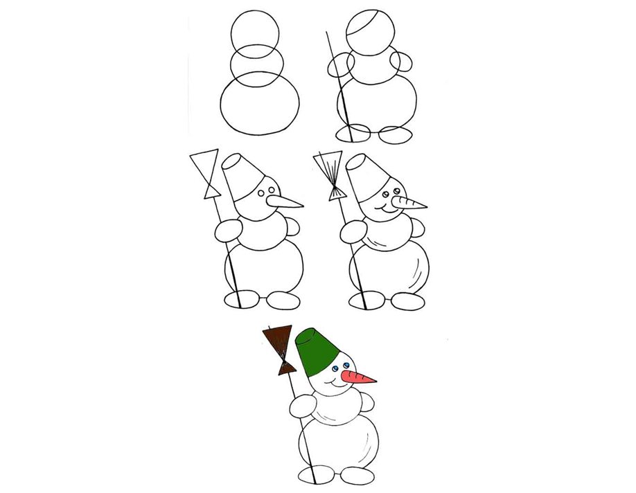 Ниже показано, как нарисовать классического снеговика из трех снежных комьев с метелкой: