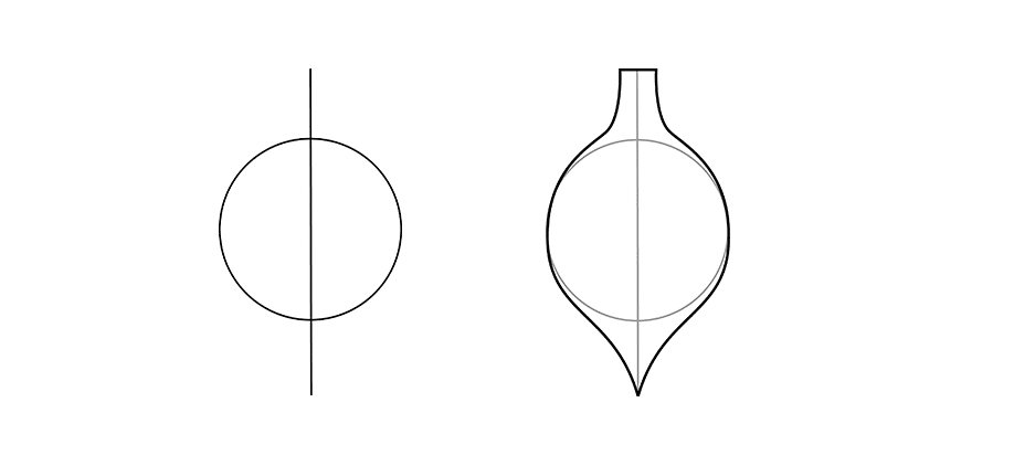 Продолговатую елочную игрушку рисуют на основе окружности, как в первом примере. Окружность делят пополам вертикальной полосой – в верхней части будет крючок для подвешивания, нижнюю делайте суженной. Ластиком сотрите карандашные ориентиры, а ребенок пусть разрисует игрушку по своему вкусу.