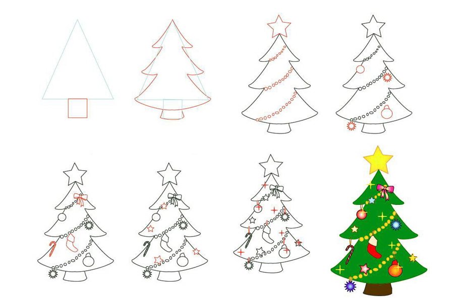 Главный атрибут новогодних праздников, казалось бы, нарисовать очень просто. Но есть некоторые хитрости и приемы, которые позволяют получить особенно красочное детализированное зимнее дерево.