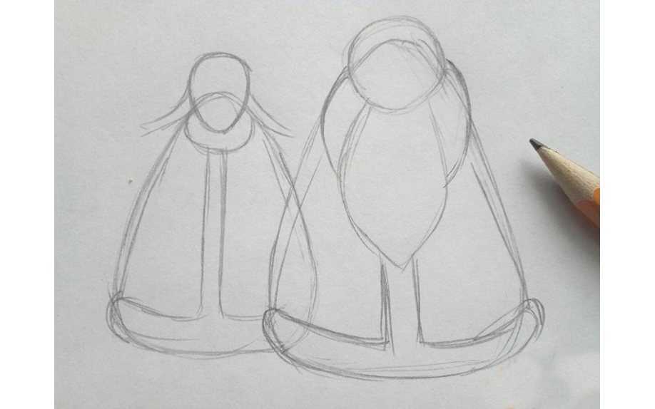 1. Нарисуйте два силуэта, напоминающие треугольники, – побольше для Деда Мороза, поменьше – для Снегурочки.