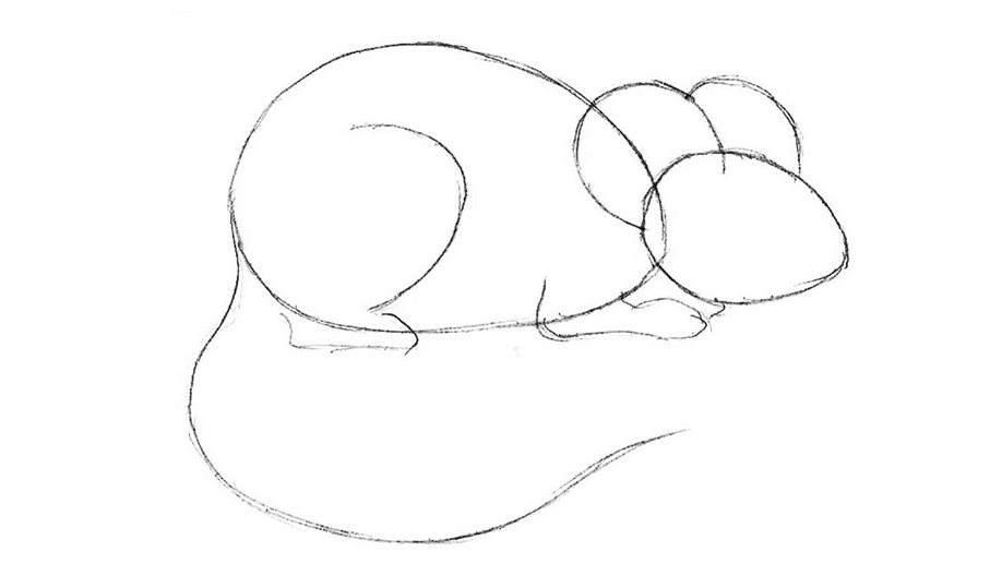 2. К голове пририсуйте пару овалов – они станут основой для ушей. Очертите лапки – задние изобразите полукругом, согнутыми в суставе. Передние будут продолговатыми и идти параллельно листу. Очертите хвост тонкой изгибающейся линией.